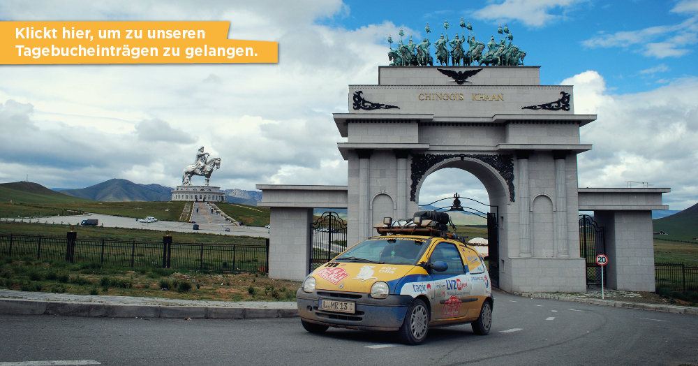 "Im Jahr 2013 nahmen wir an der Mongol Rally teil und fuhren mit einem Renault Twingo in die Mongolei. Im Vorfeld sammelten wir Geld für gemeinnützige Organisationen. Von den Abenteuern unserer 16.400km langen Fahrt berichten wir auf dieser Internetseite."